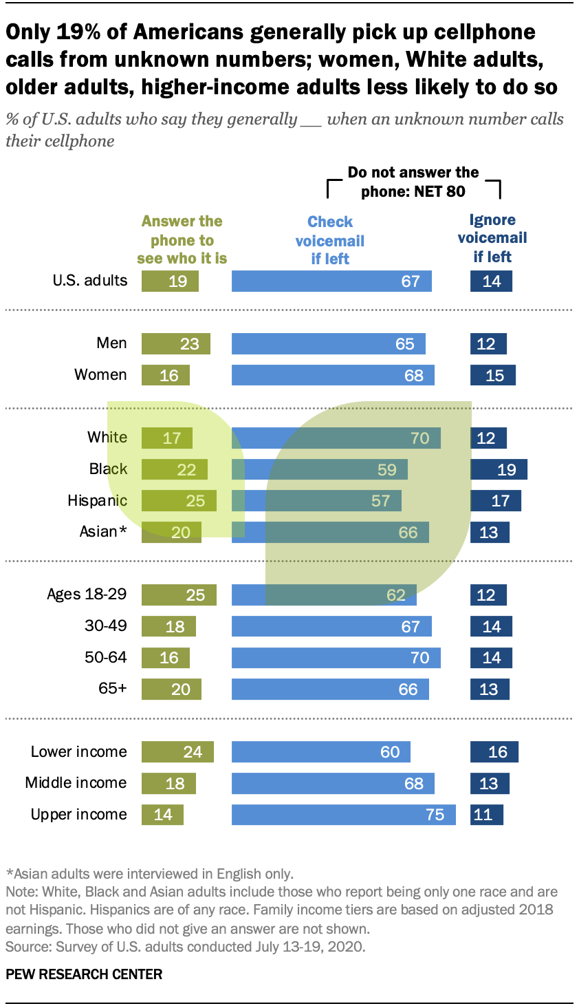 Is it a lead quality issue? No. The issue is that it’s not the 80s anymore. Nowadays people barely answer calls. Why? We live in an age of robocaller scams. According to the Pew Research Center, currently only 19% of Americans answer calls from unknown numbers.